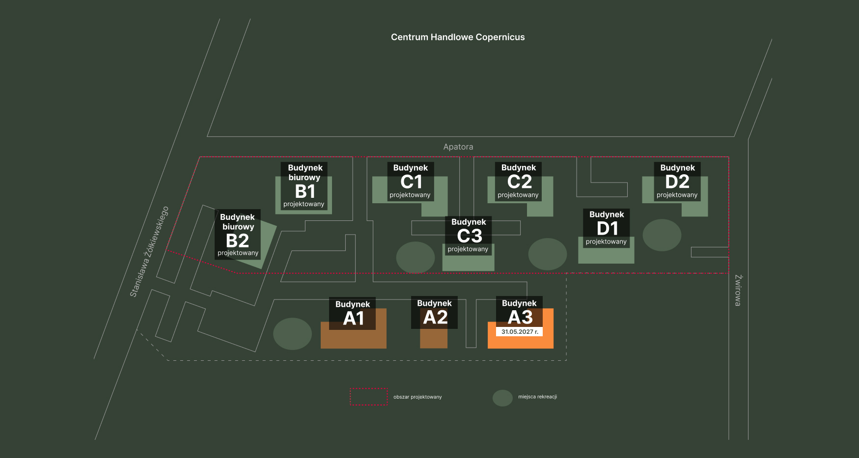 Projekt osiedla jest jeszcze dopracowywany pod kątem funkcjonalnym i wykonawczym. Prezentowany schemat zagospodarowania ma charakter poglądowy i pokazuje relacje przestrzenne, a nie finalne rozwiązania.