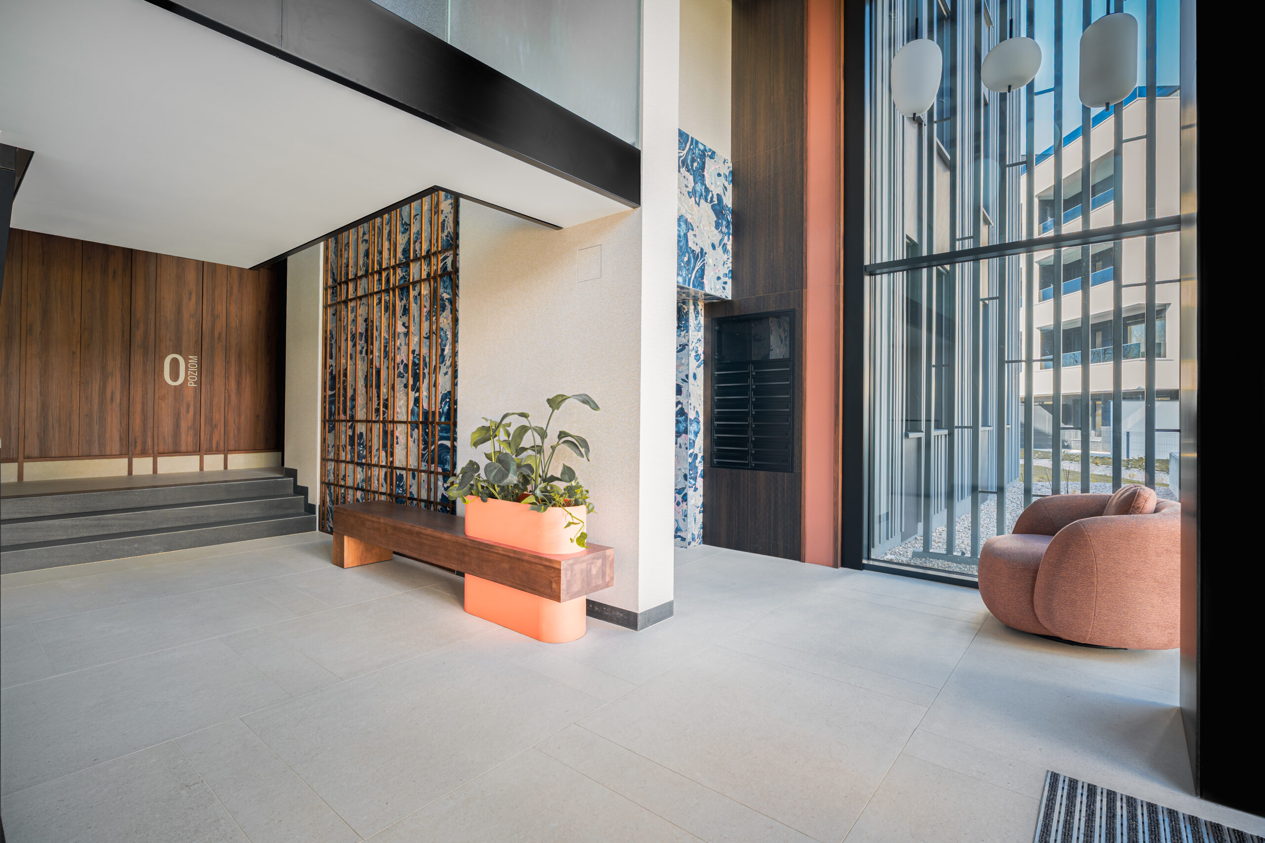 Osiedle wypełnione jest licznymi udogodnieniami zapewniającymi komfort życia na najwyższym poziomie. Eleganckie i ponadczasowe klatki schodowe, wykończone szlachetnymi materiałami, stanowią wizytówkę budynków.